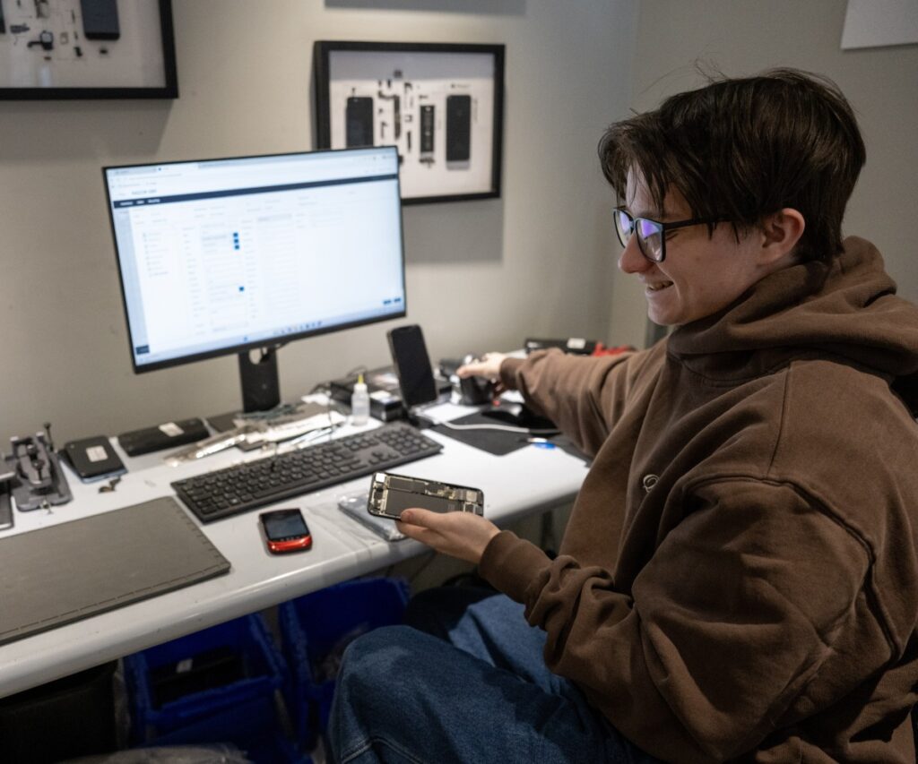 Les personnes travaillent notamment à l’effacement sécuritaire des données de téléphones cellulaires. Les postes sont soigneusement adaptés en fonction des forces et des besoins de chacun, par exemple à l’aide de supports visuels ou d’outils de travail adaptés. Un suivi par un intervenant est également assuré tout au long du parcours.